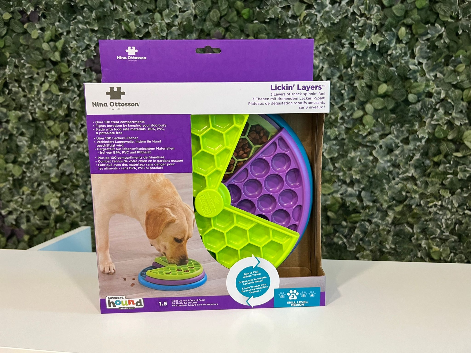 Desafie o raciocínio e a curiosidade do seu cão com o Lickin’ Layers, um brinquedo interativo de nível 2 da renomada linha Nina Ottosson by Outward Hound.